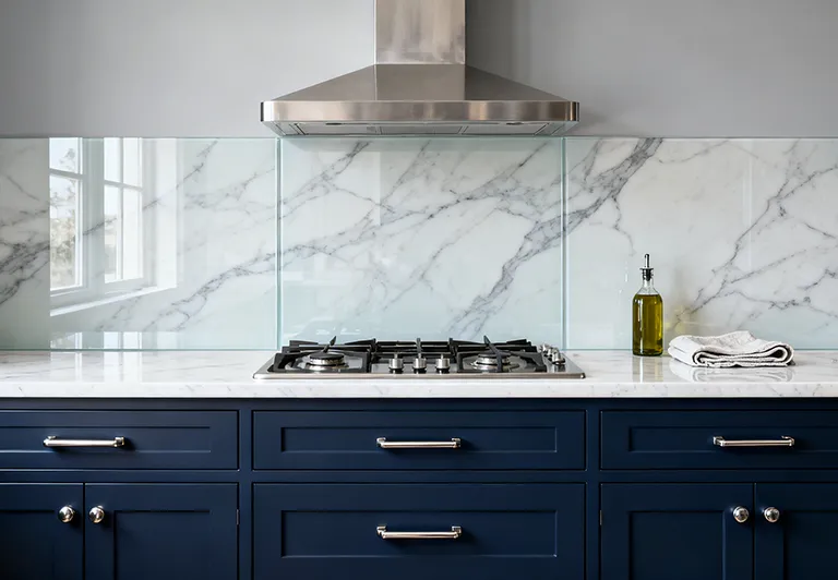 Marble-style splashbacks offer the elegance of stone with the practicality of glass.