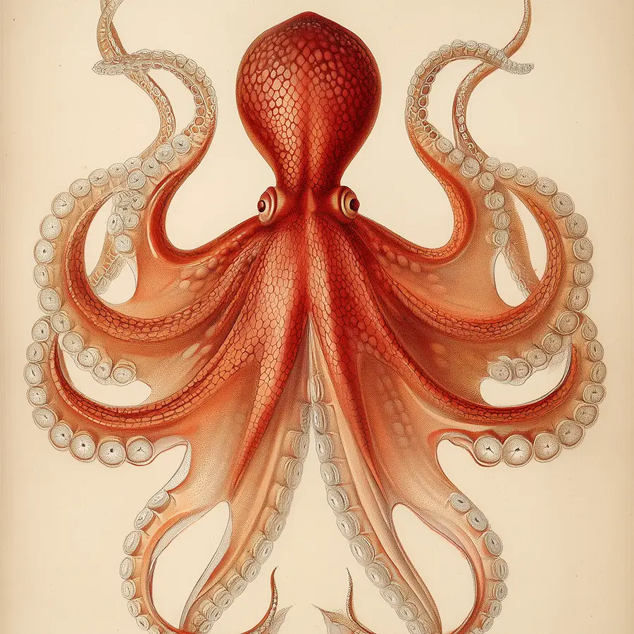A detailed vintage-style illustration of an octopus, showcasing intricate anatomy. In rich textures and bold reds, a timeless scientific artistry for elegant wall decor.