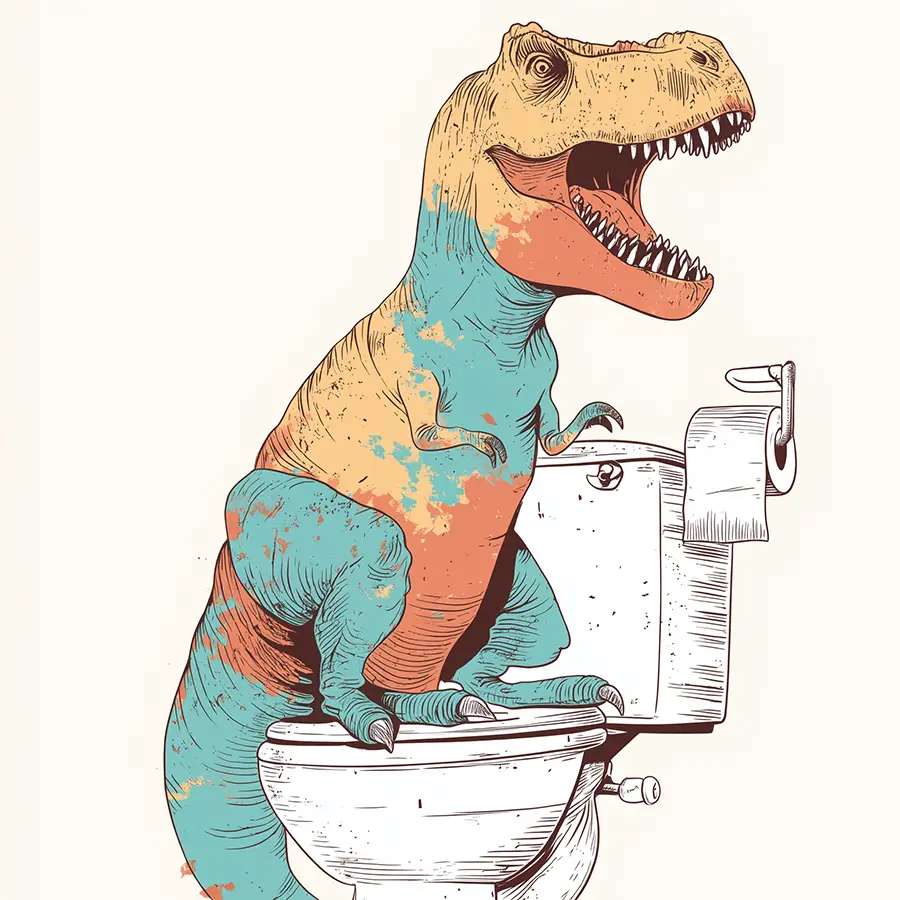 A playful illustration of a T-rex standing on a toilet, blending bold colours, humour, and quirky charm. A fun statement glass wall art piece.